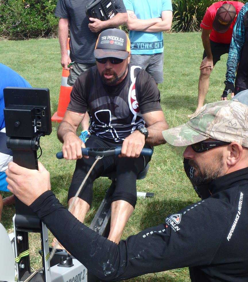There were not a lot of individual paddlers so a relay was organised with 4 teams of 3 paddlers (an OC1, a paddle board and a surf ski). After finishing we all had to do 330m on the rowing machines! The water conditions were not as bad as yesterday but challenging for some of the SUP. None of the OC1s huli’d.