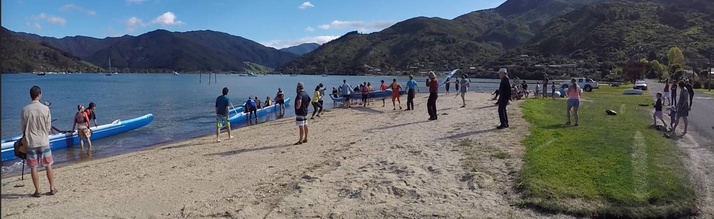 Representatives from Waikawa Marae welcomed and blessed the waka. The enthusiasm of the Outward Bound instructors was bubbling over as they gathered paddles and lifejackets and went for a short hoe around the the bay with Waikawa and Maitahi club members assisting with steering and seat one.